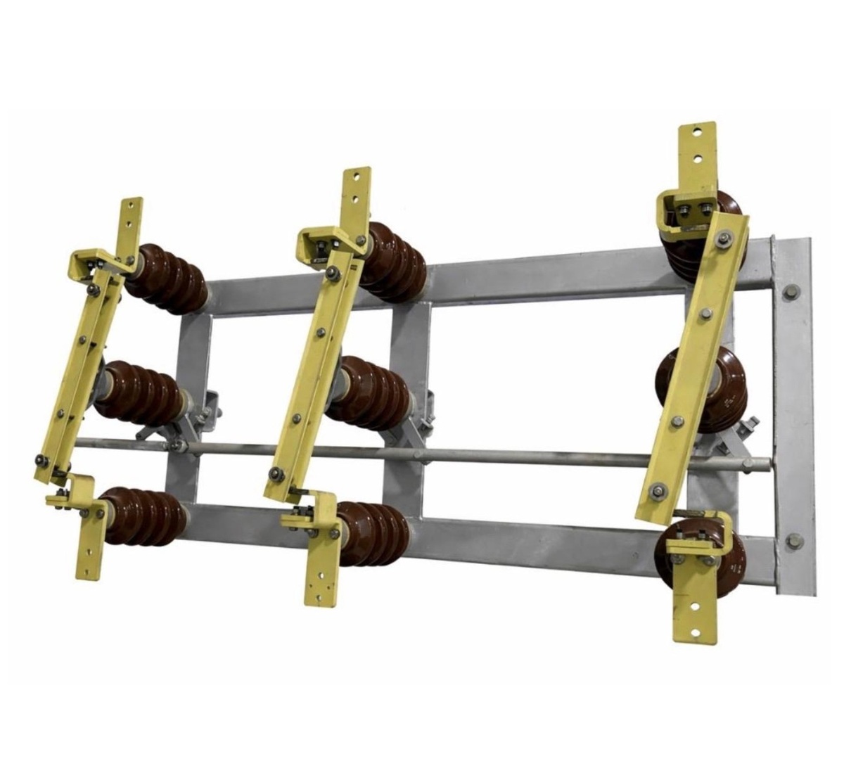 El seccionador está constituido por una base (pedestal), aisladores de soporte tipo poste, barras tirantes, el conjunto de brazos de aleación de aluminio y contactos principales en cobre. El soporte de rodamiento presenta un diseño de doble sección con sellado de aceite integrado en el bastidor, garantizando una operación suave y protegida. Para la opción de Puesta a Tierra incorpora un sistema de enclavamiento mecánico entre la cuchilla principal y la de puesta a tierra para asegurar la secuencia de maniobra correcta. Durante la operación, ambos aisladores giran 90° mediante barras transversales que sincronizan el movimiento de apertura y cierre.
